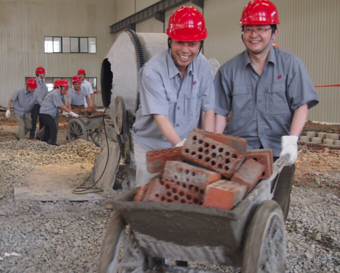 一到新厂建设工地,领导们在新厂建设办工作人员的引导下,直接来到建设中的厂房工地现场,大家分成两组,一组扎钢筋,一组搬运砖块。扎钢筋可是技术活,在工人师傅的指导下,大家认真学习,掌握要领,迅速干起活来,劳动过程中,大家还不时交流,提高工作效率;搬运砖块的领导们个个争先恐后,往推车里装砖、推车、卸车一气呵成,个个干得汗流浃背。两个组在劳动中途又进行了交换,使参加劳动的领导们有了更丰富的劳动实践。通过参加劳动,大家为新厂建设出一份力,流一点汗,以自己的劳动参与促进新厂建设进度。