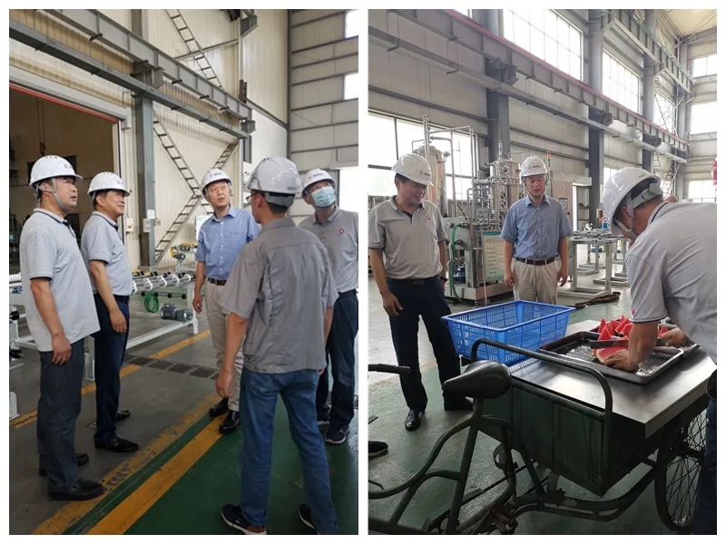 7月14日,公司党委书记、董事长陈志强、总经理孙琦带领公司党政班子成员亲临生产一线慰问职工,为员工们送上解暑的西瓜。