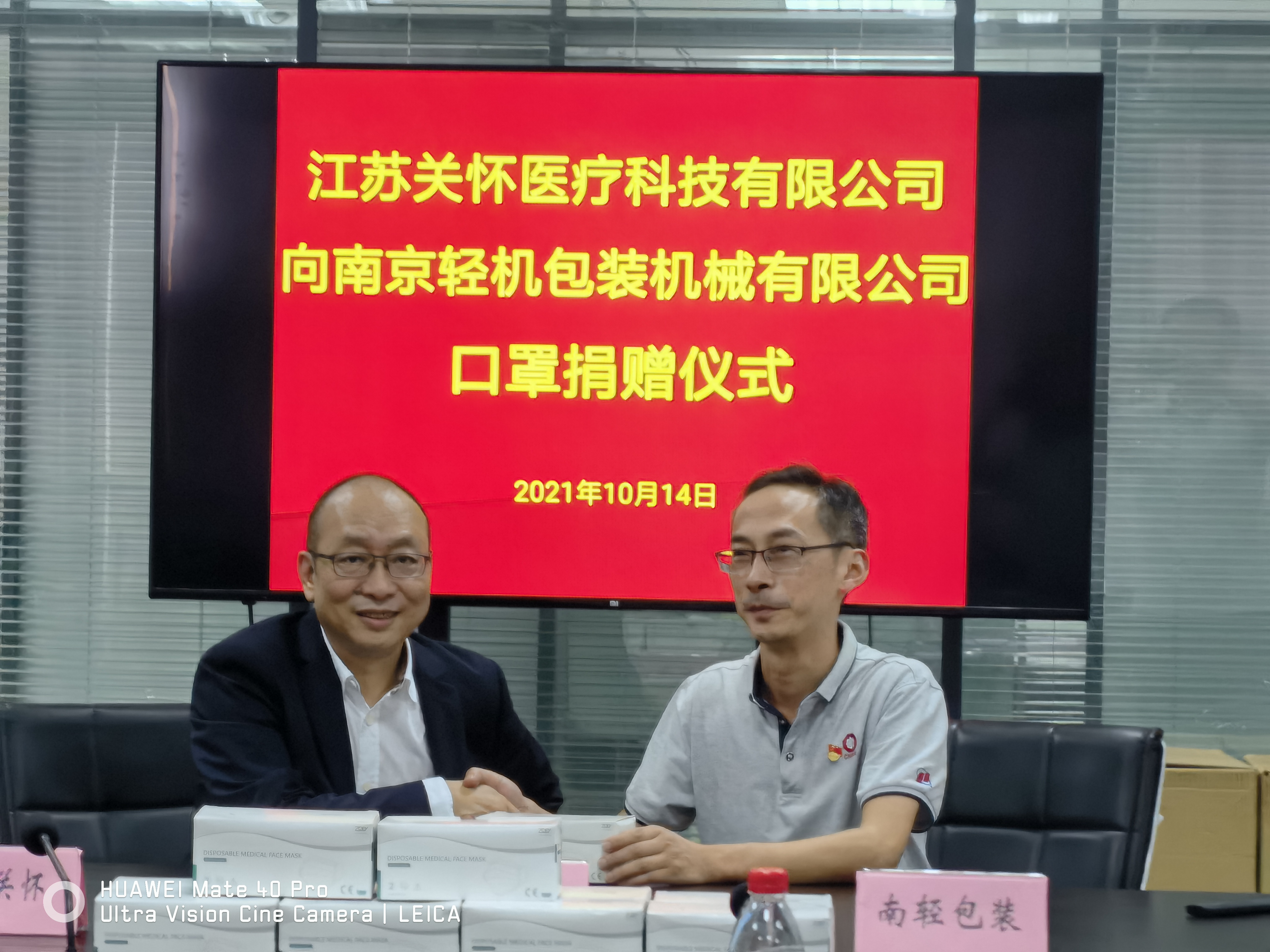 会后还举行了江苏关怀医疗赠送南京轻机2万只出口型口罩的交接仪式。
