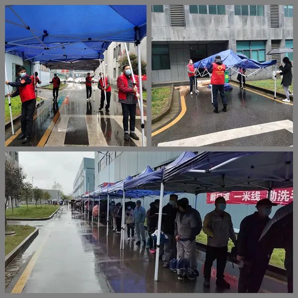 天公不作美,此时风大雨急,给露天排队等候核酸检测人员带来了不小的影响,南京轻机党员志愿者们迅速组织起来,冒雨搭建帐篷。由于前天夜里刚下了一场大雨,使得早晨的气温骤降了十多度,但瑟瑟的寒风挡不住志愿者们的热情,他们几人一组,协同配合,动作娴熟,任凭雨水㓎湿了头发和衣裳也没有一人退缩,不一会一顶顶帐篷顺利搭建完成。志愿者们又马不停蹄,顶风冒雨投入到了核酸检测服务当中去,他们有的负责大门口检查“健康码”、“行程码”,把好入口的第一道防线;有的负责维持秩序,严守待检人员“一米线”的规定;有的不厌其烦的提醒大家准备好身份证或检测码,并主动帮助初使者学习如何打开检测码,大大提高了检测效率。此时雨越下越大,而周边单位和居民也越集越多,但在一顶顶帐篷下,大家都在耐心等待,秩序井然,只有风雨中每个志愿者身上那件印有“南京轻机党员志愿者”标志的红马甲显得更加鲜艳夺目。在医护人员和志愿者的共同努力下,当天南京轻机检测点共完成了2500多人的第二次核酸检测,为全市防疫抗疫贡献了南轻力量。
