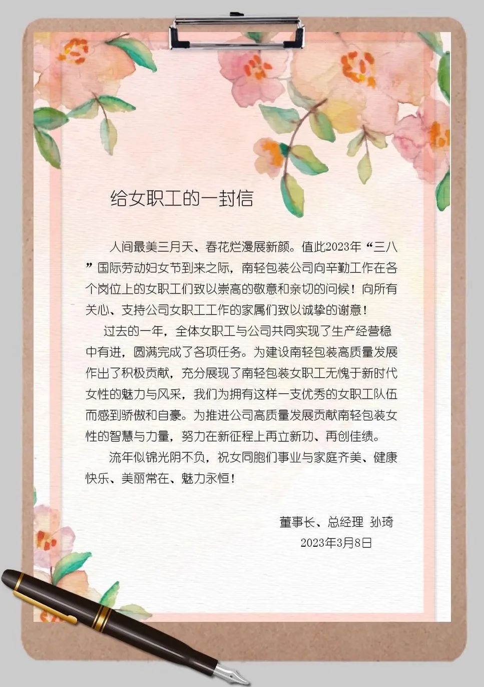 为弘扬企业文化,彰显人文关怀,在今年“三八”国际妇女节来临之际,中国联合装备集团副总经理、南轻包装公司董事长、总经理孙琦为女职工发出了一封热情洋溢的慰问信,勉励大家立足岗位,鼓足干劲、不负韶华,为实现南京轻机高质量发展再立新功。