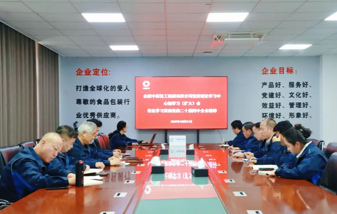 中辰轻机党委召开党委理论学习中心组(扩大)学习会,专题传达学习党的二十届四中全会精神,并进行交流研讨,研究部署学习宣贯工作。会议要求,把学习领会全会精神同深入学习贯彻党的二十大和二十届二中、三中全会精神,同打造全球化的受人尊敬的食品包装行业优秀供应商的企业定位结合起来,以科技创新赋能产业升级,以高质量发展引领转型突破,真正做到学深悟透、融会贯通,以全会精神进一步统一思想、凝聚共识,激发广大干部职工干事创业的热情,为实现“十四五”圆满收官和“十五五”良好开局打牢坚实基础。