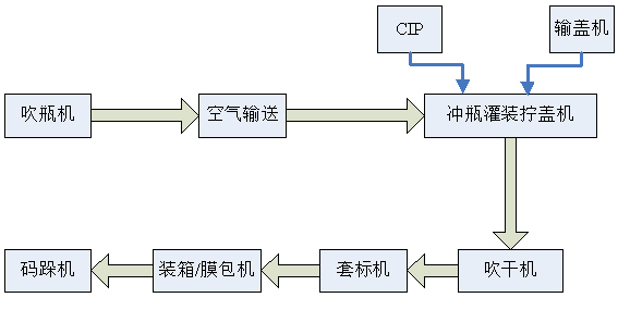 b)Main machines: blow molder, rinser & filler & capper, sleeve labeler, carton packer, palletizer, bottle & case conveyor, cap conveyor, etc.
