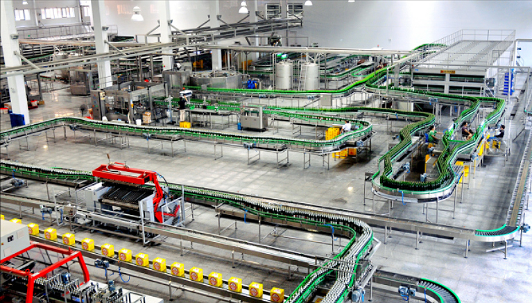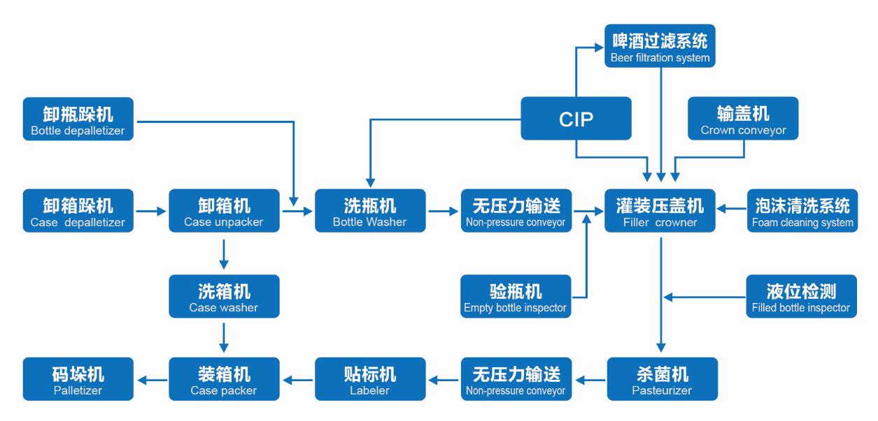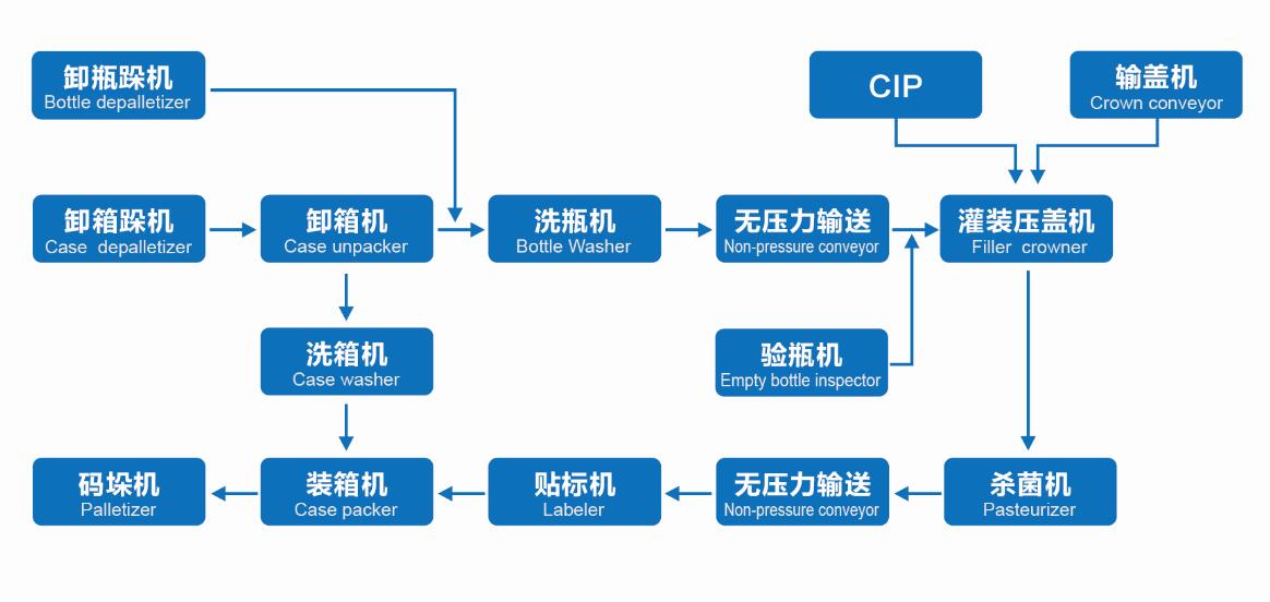 b)Main machines: depalletizer, case unpacker, bottle washer, filler, pasteurizer, case packer, palletizer, bottle & case conveyor, labeller, CIP, etc.