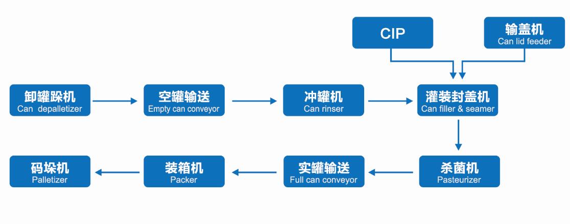 b)Main machines: depalletizer, can rinser, can filler & seamer, pasteurizer, carton packer (shrink wrapper), palletizer, can & case conveyor, CIP, etc.